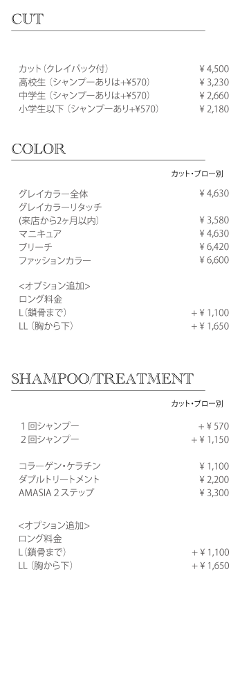 ⇒最終受付時間 カット 17:00 / カラー•パーマ 16:00 /縮毛矯正 15:00