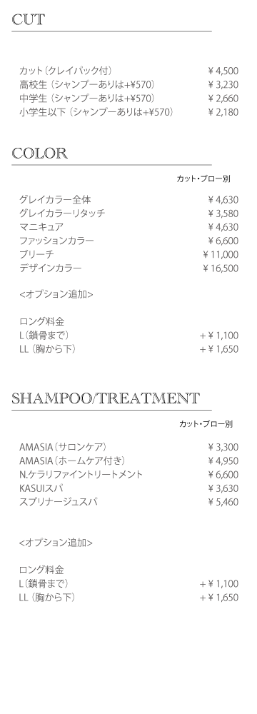 ⇒最終受付時間 カット 16:00 / カラー 16:00 /パーマ 15:00